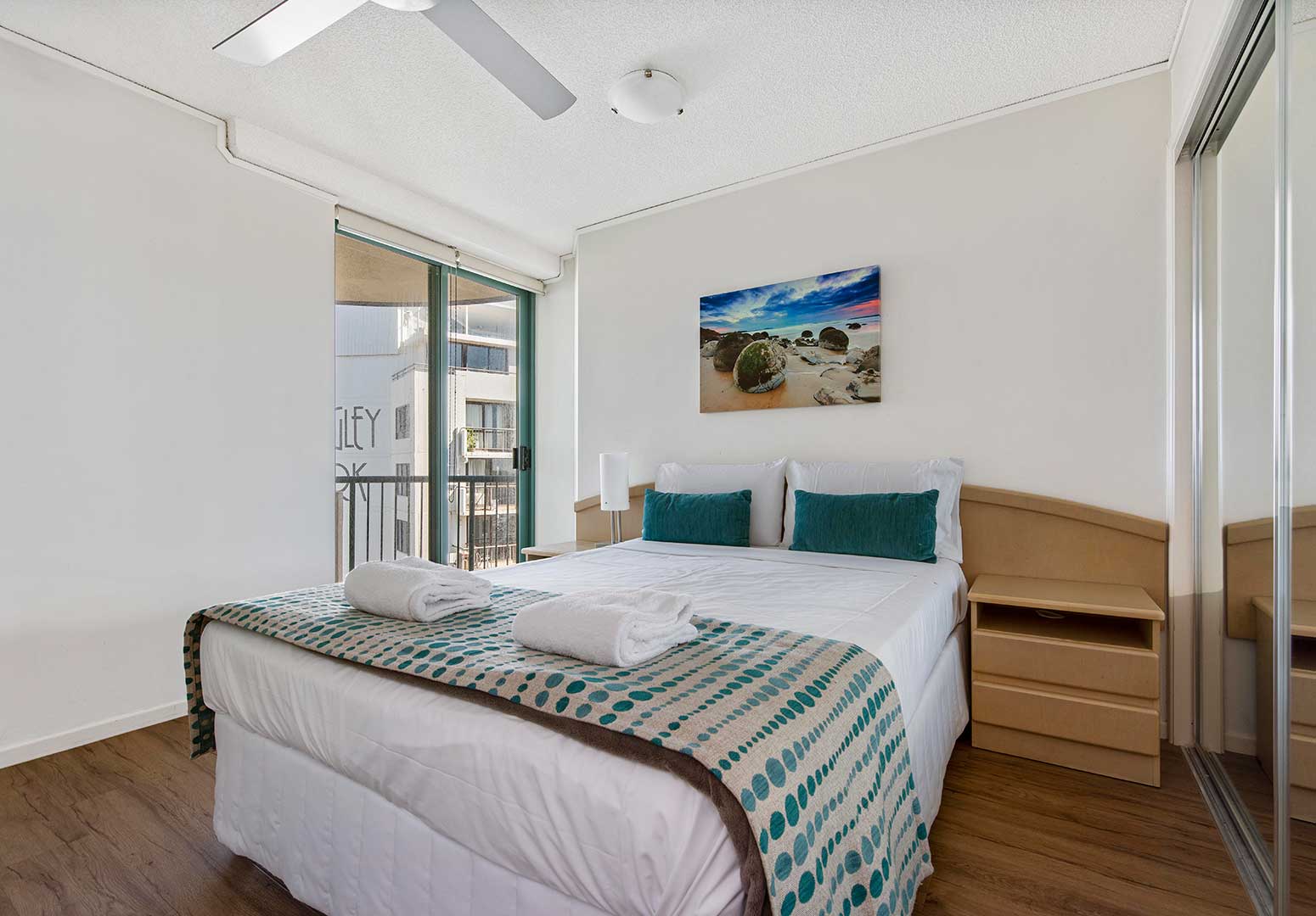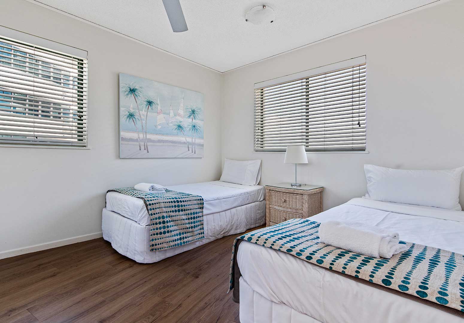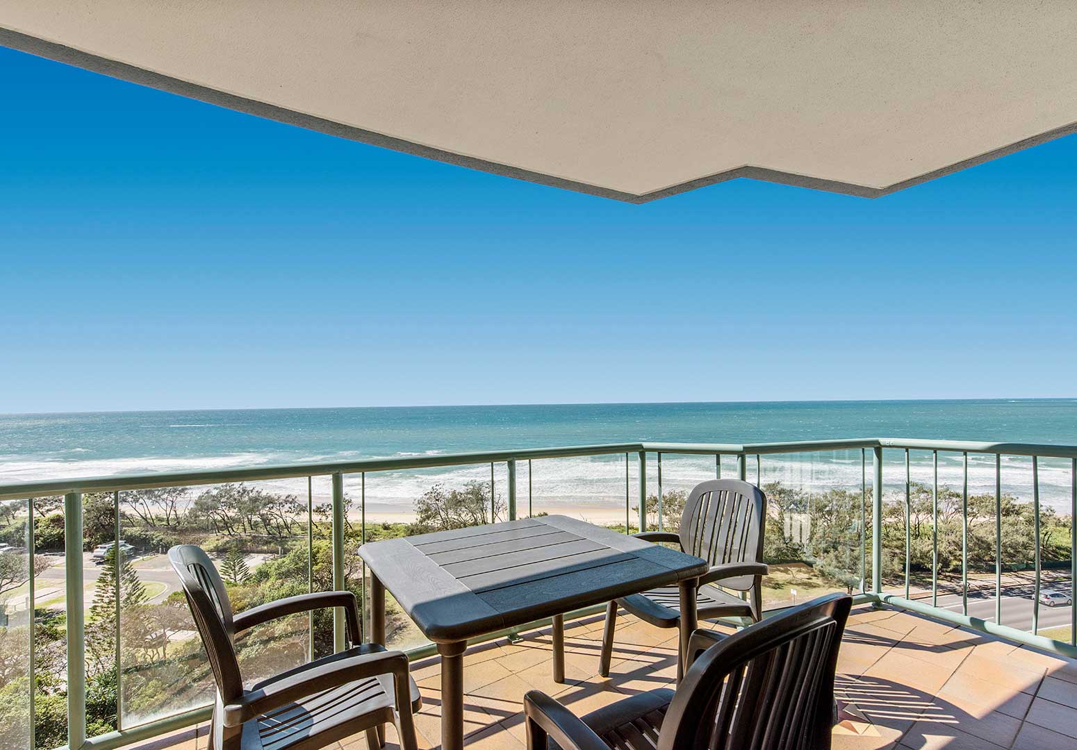 Accommodating up to six guests, these apartments share the same spacious layout as other three-bedroom options, featuring floor-to-ceiling glass sliding doors that open onto a private beachfront balcony. Inside, a large open-plan living area and fully self-contained kitchen provide all the comforts of home. The master bedroom includes a queen bed and ensuite, the second bedroom also has a queen bed, and the third bedroom is furnished with two single beds. A main bathroom with shower/bath and a separate toilet complete the space.